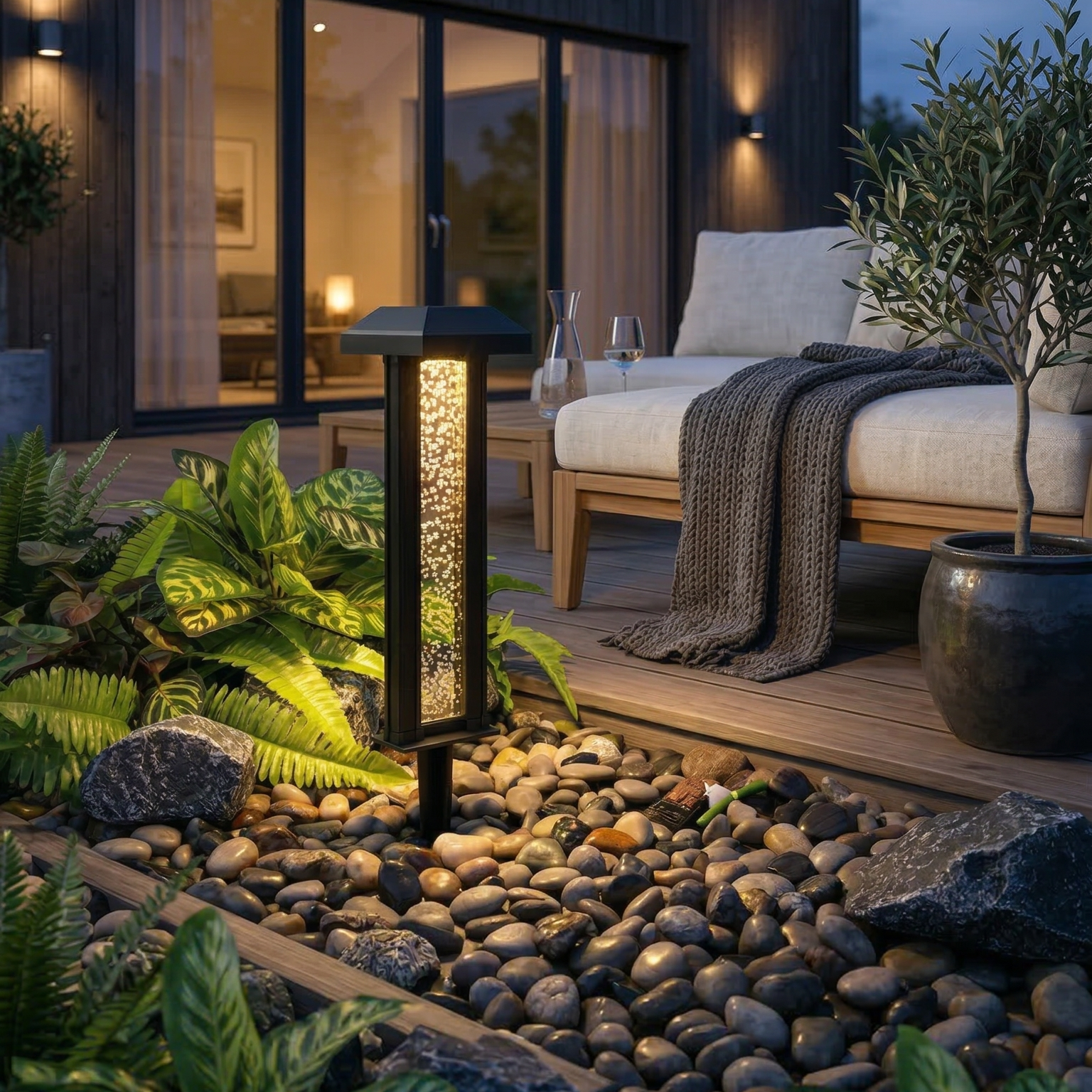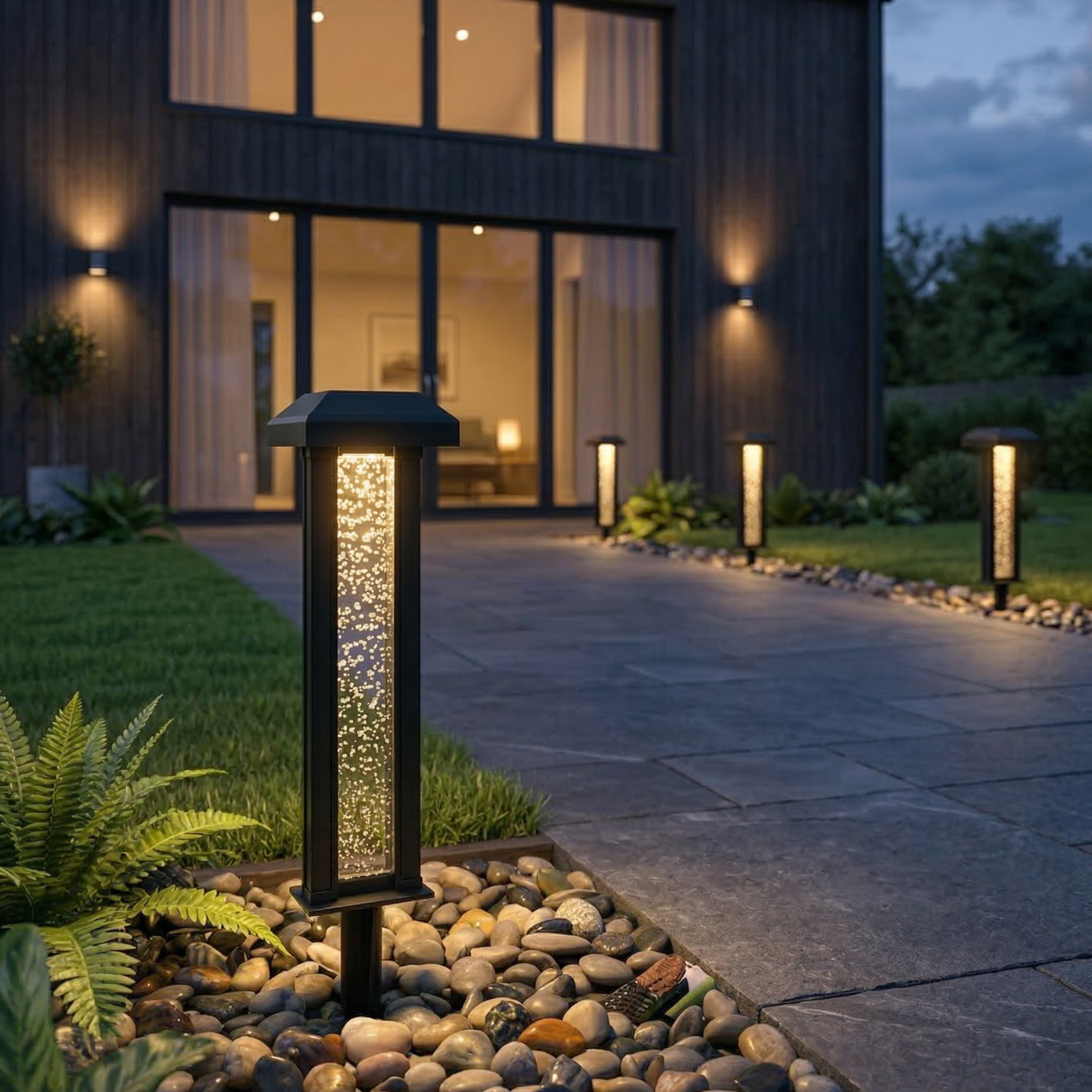 Denne stilrene LED solcelle havelampe kombinerer moderne design med dekorativ belysning til haven. Lampen har et elegant sort stel og et dekorativt glasrør med bobleeffekt, som skaber et flot og levende lysspil, når lampen er tændt.