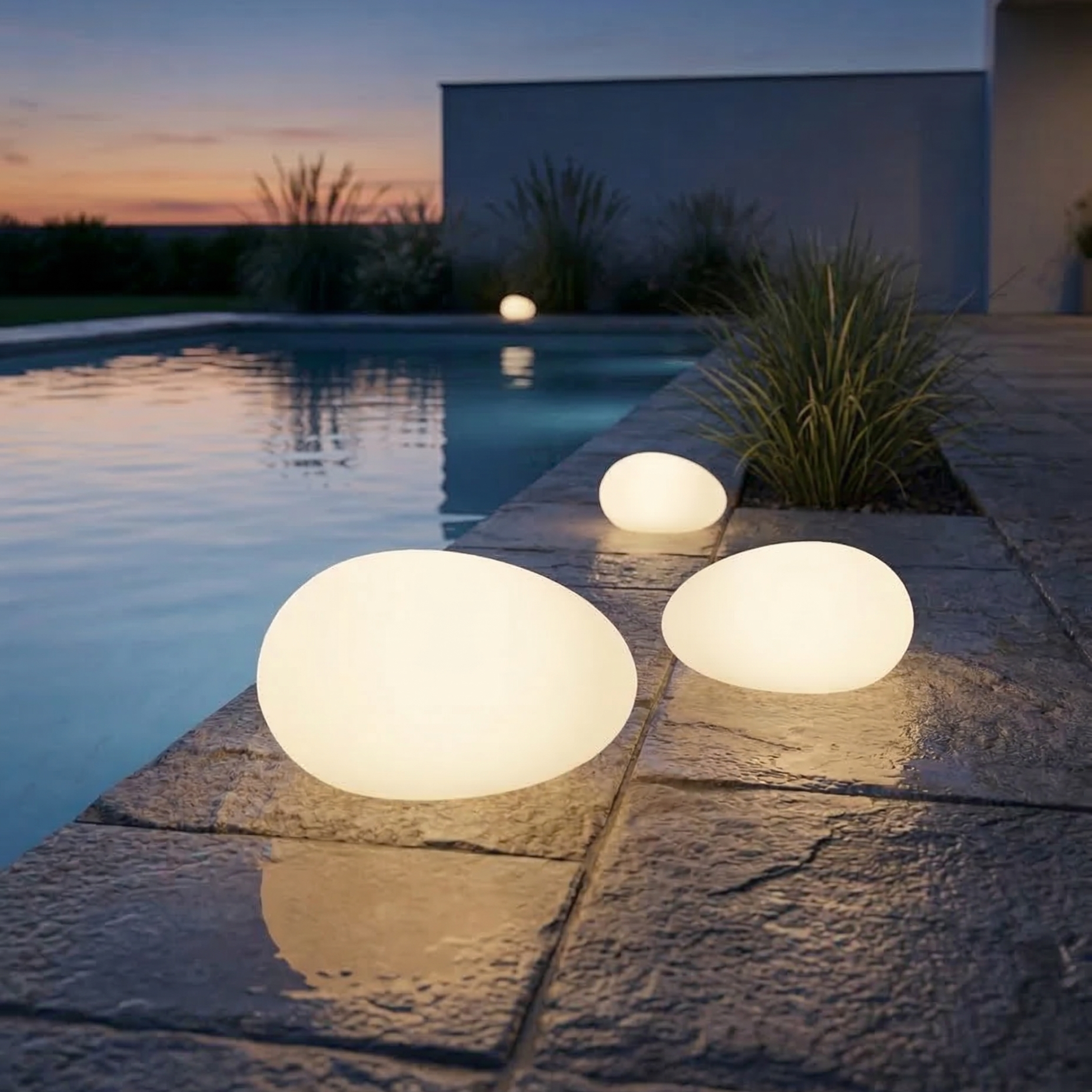 Skab en hyggelig og dekorativ stemning i haven med disse elegante LED solcelle stenlamper. Sættet består af flere sten i forskellige størrelser, som giver en naturlig og harmonisk belysning i haven.